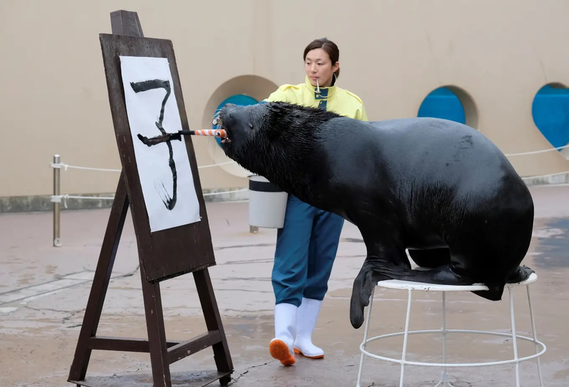 Bild: Kazuhiro Nogi, Seelöwe Leo schreibt das Schriftzeichen für «Ratte» im Hakkeijima-Meeresparadies in Yokohama. Anlass war das chinesische Jahr der Ratte, das 2020 begann.