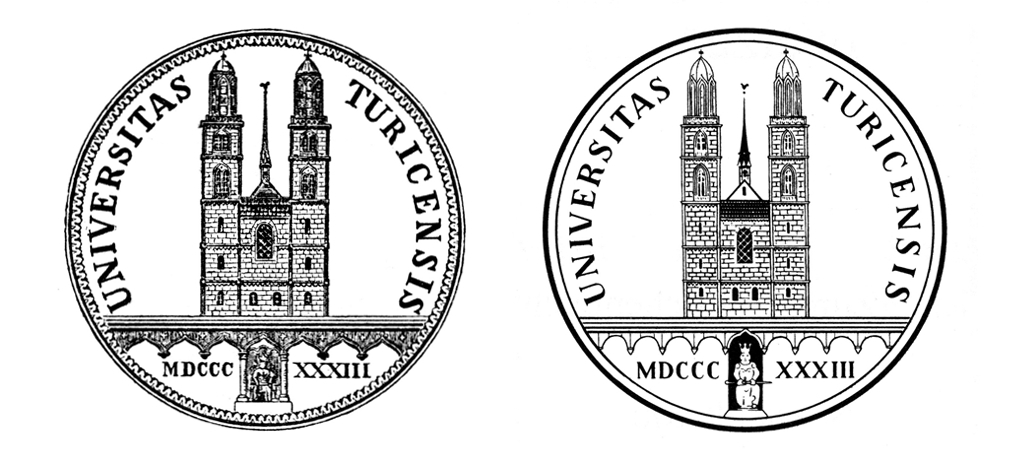 1932, im Vorfeld der Feierlichkeiten zum 100-jährigen Bestehen der Universität, fasste der Senatsausschuss den Beschluss, dass künftig amtliche Aktenstücke und Drucksachen der Universität Zürich wieder das alte Zentralsiegel tragen sollten. Auf diesem ist ein Fassadenbild des Zürcher Grossmünsters abgebildet, in dem am 20. April 1833 die Stiftungsfeier der Universität stattgefunden hatte.