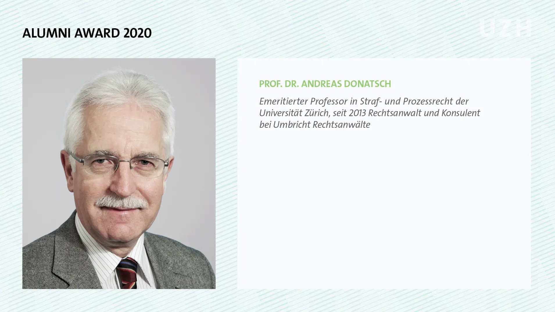 Dieses Jahr wurde der Alumni Award Prof. Dr. Andreas Donatsch verliehen. Prof. Dr. Andreas Donatsch gehört zu den Visionären der Alumnikultur an der UZH. Von 2004 bis 2019 präsidierte er die Ius Alumni. Er war auch Gründer und unermüdlicher Motor der Ius-Alumni-Stiftung und schaffte mit dem Ius-Alumni-Haus einen Wohn- und Begegnungsort für Austauschstudierende der Partnerfakultäten in aller Welt. Damit leistete Prof. Dr. Andreas Donatsch einen wichtigen Beitrag zur erfolgreichen internationalen Vernetzung der Rechtswissenschaftlichen Fakultät der UZH. Herzliche Gratulation!