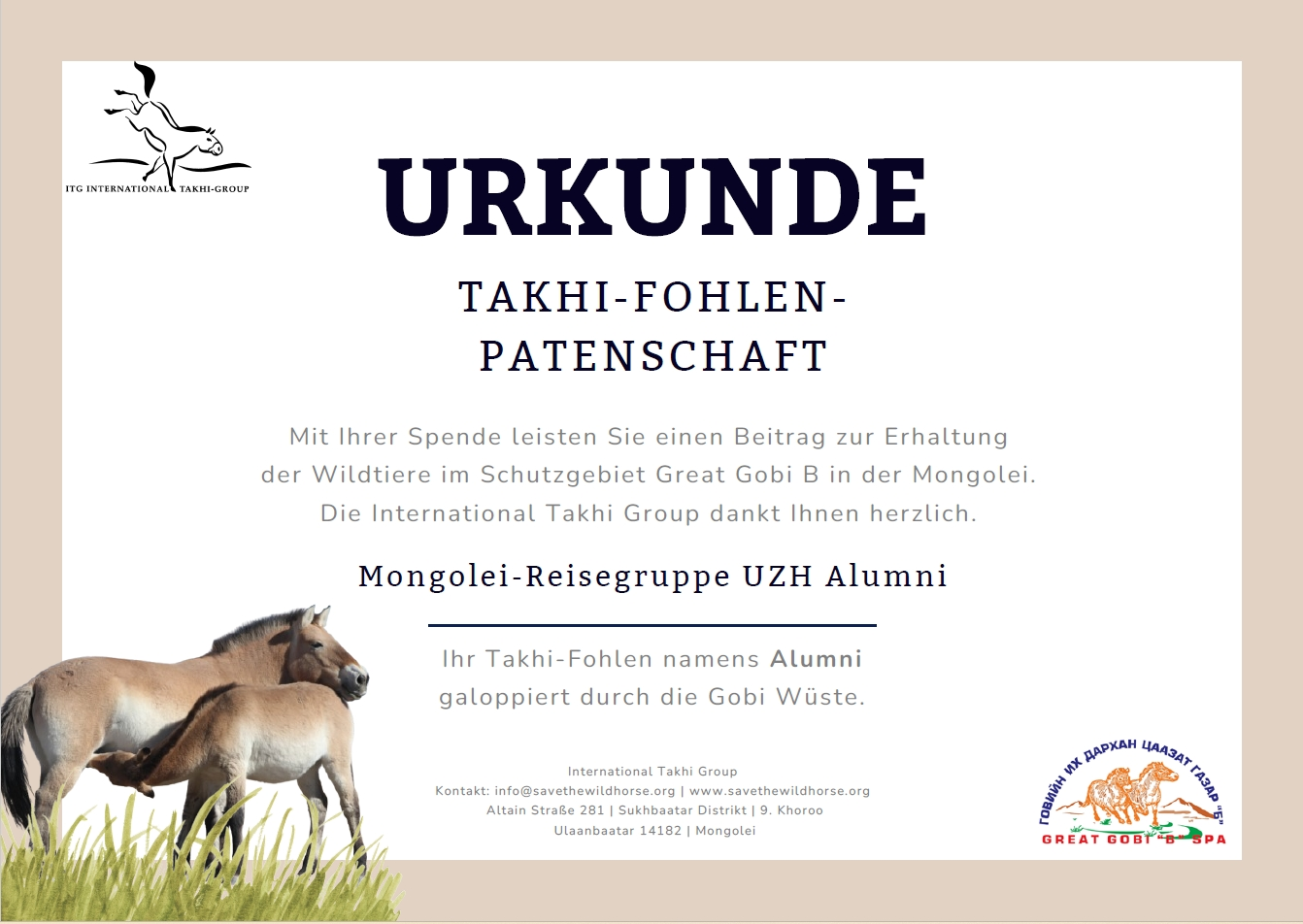 Den letzten Tag in Ulaanbaatar verbrachten die meisten mit Shopping und Museumsbesuchen. Er endete mit einem Abendessen über den Dächern von Ulaanbaatar und dem Abschied von Tamir, unserem liebgewonnenen Guide, bevor wir eine letzte, kurze Nacht im Hotel verbrachten: aufstehen um 4:30 Uhr. Nach über 18 Stunden Reise landete die Alumni-Reisegruppe müde, aber mit vielen einzigartigen Erinnerungen in Zürich. Mit einer Patenschaft für ein Takhi-Fohlen in der Mongolei wird die Alumni-Reisegruppe auch in der Mongolei verankert bleiben.