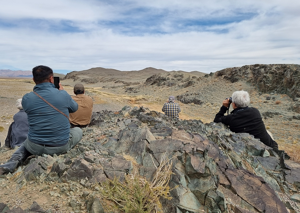 Da in Takhiin tal immer wieder Forschende logieren, hatten wir am nächsten Tag das Glück, dass sowohl der ehemalige Nationalparkdirektor Ganbaatar wie auch zwei Pferdeforscherinnen uns in die Wüste begleiteten und Interessantes aus ihren Tätigkeiten erzählen konnten. Feldstecher und Teleskop sind hier ein Muss – ohne kann man die Tiere kaum ausmachen. Trotz der grossen Distanz ist es immer wieder schön, Takhis, Khulane und Kropfgazellen zu sehen und zu merken, dass sie hier wirklich wild leben und Distanz halten. Am Abend führten uns Toogoo, Tourismus-Verantwortlicher in Takhiin tal, und Tamir in die traditionellen Knochenspiele der Nomaden ein. Beim „Pferderennen“ winkte als Sieg die Möglichkeit, einem diesjährigen Fohlen einen Namen zu geben.