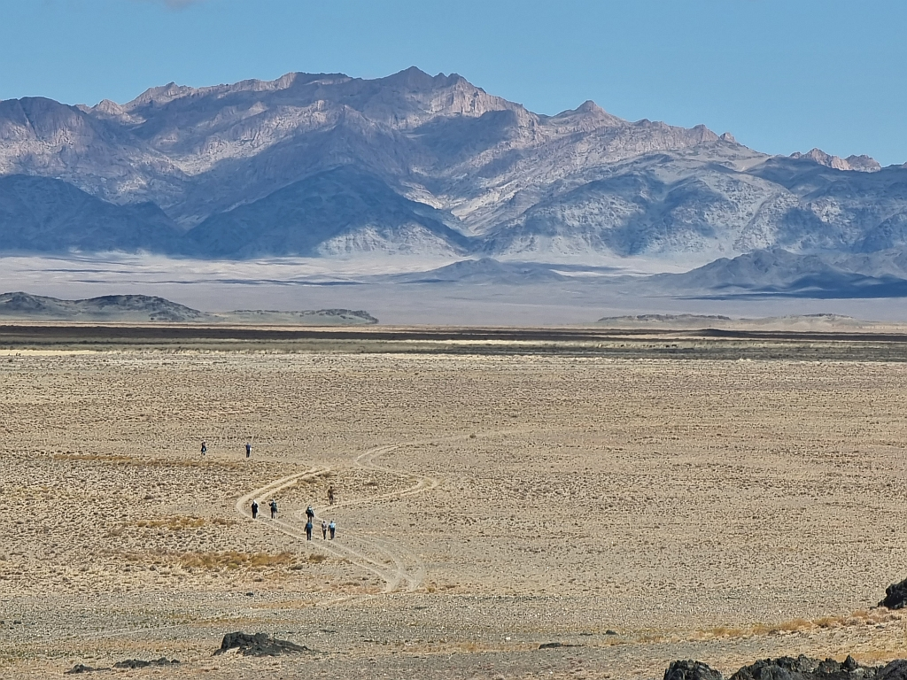 Gegen Abend kam die Reisegruppe in ihren Landcruisern in Takhiin tal an und konnte ihre Jurten beziehen – Touristenjurten zwar, aber sie vermittelten trotzdem etwas den Eindruck eines mongolischen Heims. In Takhiin tal steht das Nationalparkhaus der Great Gobi B SPA und es ist auch der Ort, wo die Wiederansiedlung der Przewalskipferde 1992 durch die International Takhi Group begann. Und ebendiese Przewalskipferde oder Takhi wollten wir aufspüren. Ein Trip zu den Five Hills, die einen Überblick über einen Teil der Wüste Gobi vermitteln, führte uns bereits an einer Gruppe Takhi vorbei, die immer mal wieder das ursprüngliche Angewöhnungsgehege aufsucht. Hingegen konnten wir von den Five Hills aus, keine weiteren Tiere ausmachen. Um die Weite nicht nur zu sehen, sondern auch zu erleben, erkundeten die meisten Gäste die Rückkehr nach Takhiin tal in drei bis fünf Stunden zu Fuss.