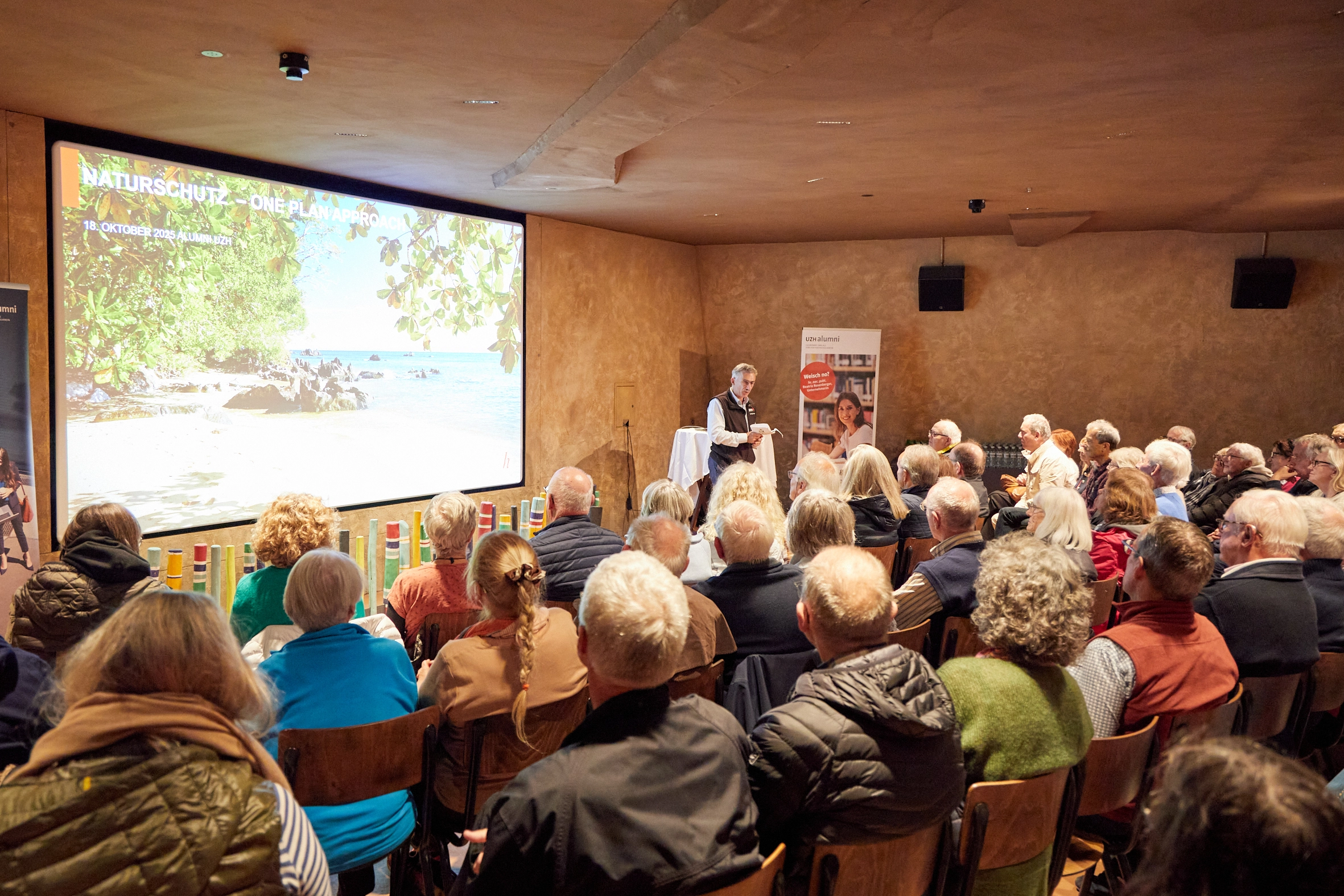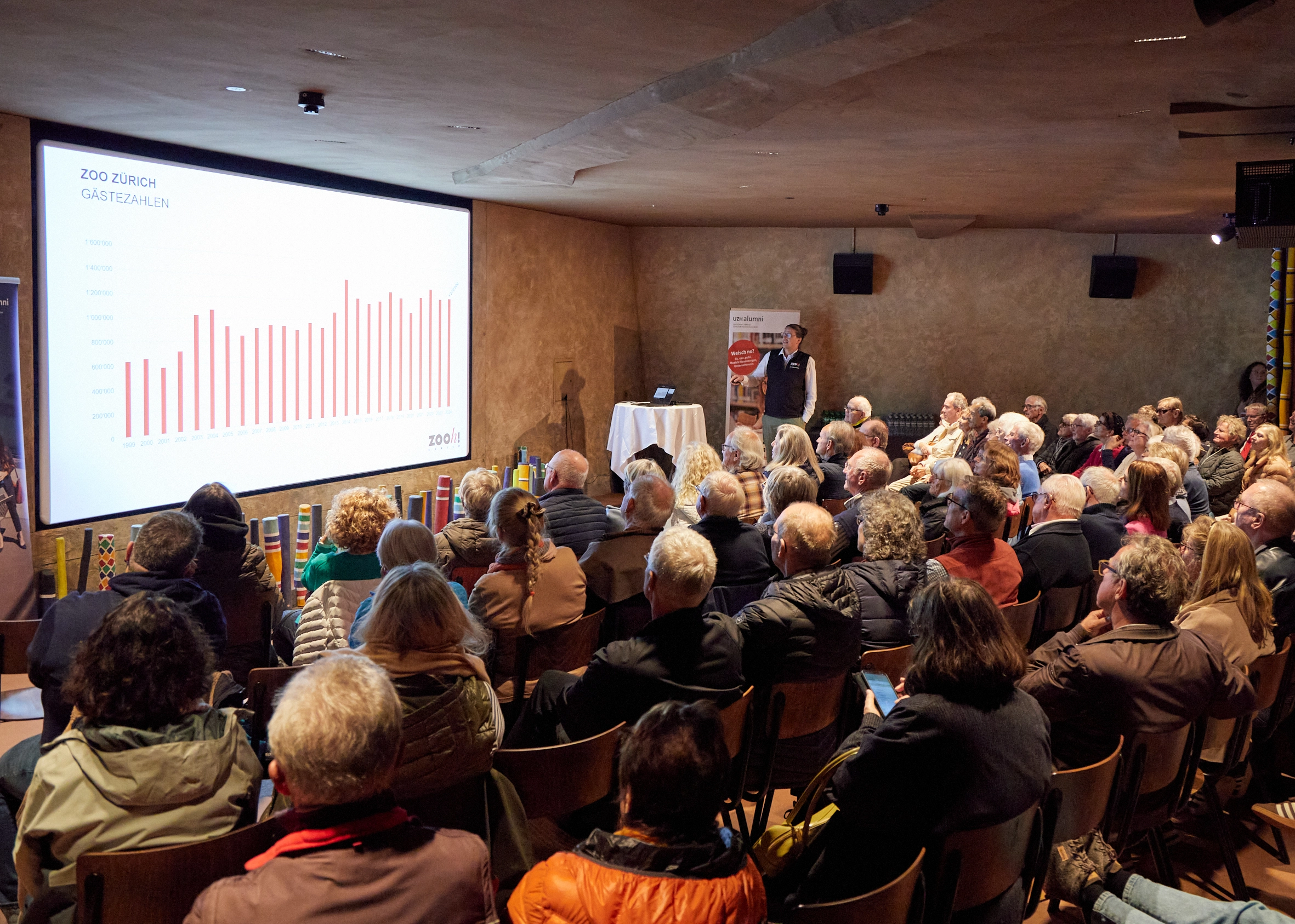Prof. Dr. Roland Sigel, Dekan der Mathematisch-naturwissenschaftlichen Fakultät, zeigte eindrucksvoll, wie Forschung der UZH mit dem Zoo zusammenwirkt – von Biodiversität bis Verhaltensbiologie. Darunter auch das Projekt von Sofia Forss, die zur Urbanisierung von Primaten forscht und dabei vom Fonds zur Förderung des Akademischen Nachwuchses von UZH Alumni unterstützt wird.