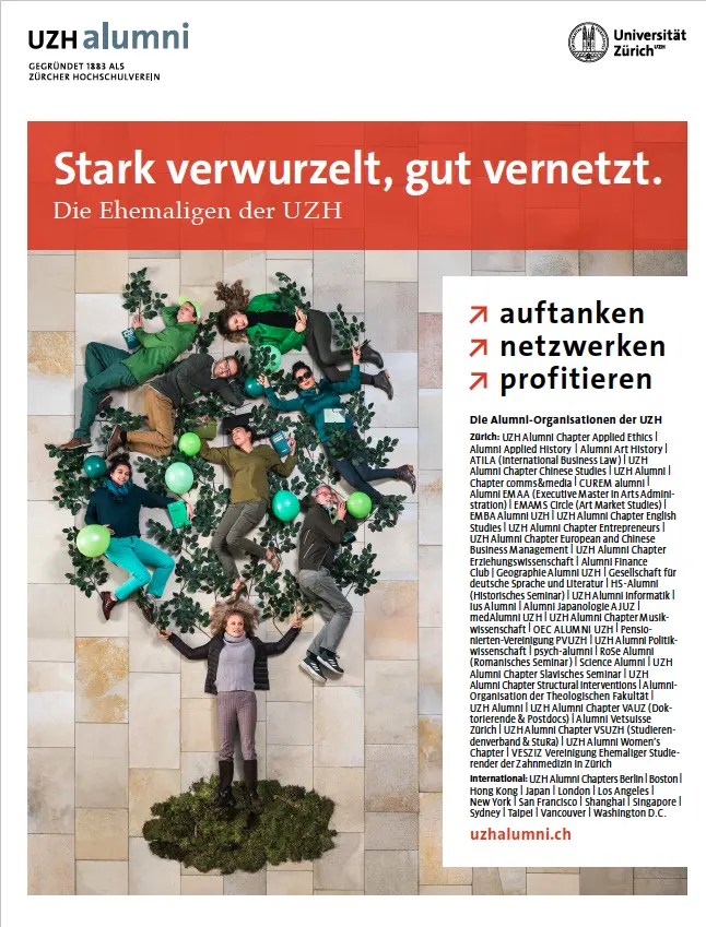 Der Alumni-Baum symbolisiert in vielfacher Weise die Verbundenheit der Ehemaligen mit ihrer Alma Mater – ganz im Sinne des Slogans: «Stark verwurzelt, gut vernetzt». Schliesslich tragen die Alumnae und Alumni ihre Universität ein Leben lang in ihrem CV mit sich. Über die Alumni-Organisationen bleiben die Ehemaligen mit ihren Kommiliton*innen und der UZH in Kontakt, pflegen alte und gewinnen neue Kontakte – der Alumni-Baum verändert sich und wächst beständig.
