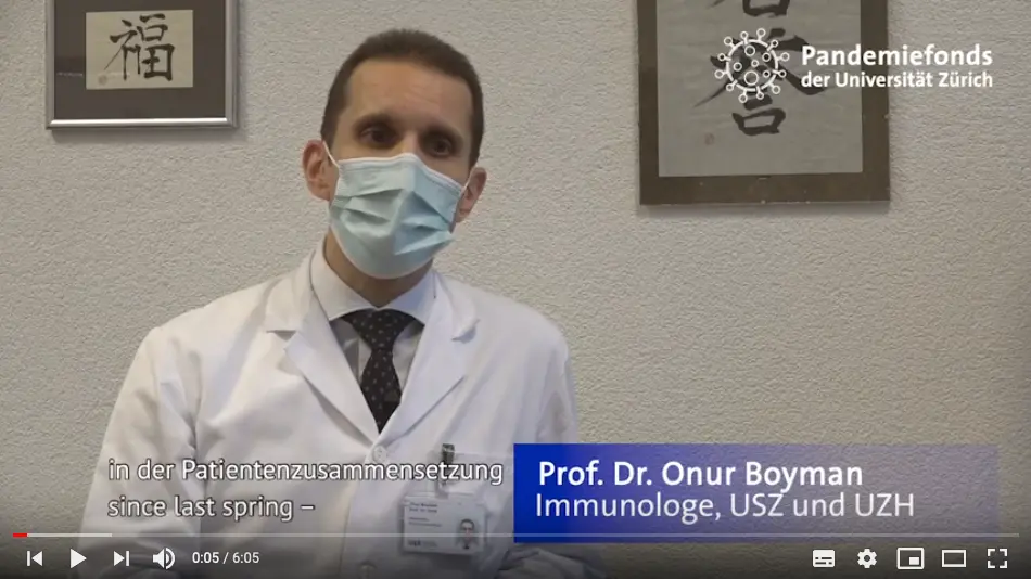 Die Gründe für einen schweren Verlauf einer Covid-19-Erkrankung untersucht Onur Boyman, Direktor der Klinik für Immunologie am Universitätsspital (USZ) und Professor für Klinische Immunologie der Medizinischen Fakultät der UZH. Seine bisherigen Erfahrungen am USZ bestätigen, dass aktive Vorerkrankungen wie Diabetes, gewisse Herz- und Lungenkrankheiten, hohes Übergewicht und ein aktives Krebsleiden den Krankheitsverlauf negativ beeinflussen können. Das ist auch einer der Gründe, weshalb ältere Leute ein höheres Risiko für schwere Verläufe hätten, da diese Vorerkrankungen im Alter häufiger vorkommen, so Boyman. Bei jüngeren Menschen mit schwerem Verlauf zeigt sich jedoch ein komplexeres Bild, als ursprünglich angenommen. Doch haben die Spitäler bei der Behandlung schwerer Fälle rasch dazugelernt (siehe Video).