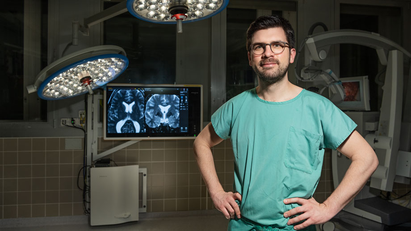 Im Jargon nennt man es «den Kopf eröffnen». Einen Schnitt durch die Kopfhaut führen und diese mit Spreizern fixieren. Ein Loch in den Schädelknochen bohren, mit der Säge eine Zugangsöffnung aussparen. Die harte Hirnhaut hufeisenförmig auftrennen und sie zur Seite klappen. Jetzt liegt das Gehirn frei. «Schon beim allerersten Mal war das für mich ein faszinierender Moment und ist es jedes Mal wieder», sagt Marian Neidert. «Die Ästhetik des pulsierenden Gehirns. Der Respekt und die Ehrfurcht beim Anblick dieses Organs. Es steuert alles, was uns ausmacht. Unser Denken, unser Handeln, unser Wesen.» Bevor Marian Neidert zum Skalpell greift, plant er den Eingriff wie ein Pilot seinen Langstreckenflug. Er wertet Bilder aus, setzt Wegpunkte, legt Strategien fest. Besonders wichtig ist dies dann, wenn Tumoren an wichtige Funktionszentren stossen. Da braucht es Vorsichtsmassnahmen. Elektrische Stimulationen etwa, welche die Nähe zu wichtigen Strukturen wie motorische Bahnen anzeigen. Und Fluoreszenzfarbstoffe, Ultraschall oder intraoperatives MRI, die den Tumor besser sichtbar machen.