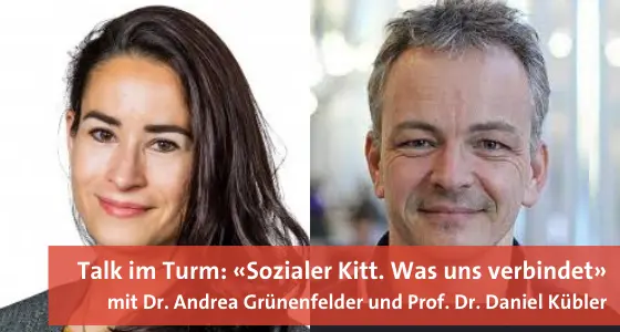 Psychologin, Mediatorin und UZH-Alumna Dr. Andrea Grünenfelder und der UZH-Politikwissenschaftler Prof. Dr. Daniel Kübler diskutieren am neuen Talk im Turm zum Thema «Sozialer Kitt. Was uns verbindet». Moderation: Thomas Gull und Roger Nickl, Redaktoren des UZH Magazins.