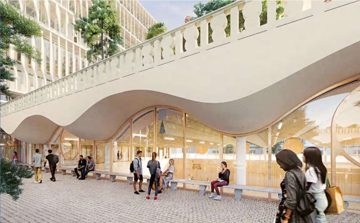 Diese Durchlässigkeit für die Öffentlichkeit und die städtebauliche Aufwertung des Quartiers durch den Stadtplatz hätten die Jury am Projekt besonders überzeugt, sagt François Chapuis. Nicht minder beeindruckt hat ihn aber die innere Organisation des Gebäudes, das einen «fast schon absurden Nutzungsmix» aufweise. «Herzog & de Meuron haben die Kombinationen der vielseitigen Anforderungen brillant gelöst», sagt Chapuis. Die verschiedenen Nutzungen sind in drei Zonen untergebracht und miteinander verschränkt. Der Sockel bietet Raum für Lehre sowie Sport und Verpflegung. Darüber schwebt ein mehrstöckiger Baukörper, der Räume für das Lernzentrum und die Forschung umfasst. Verbunden werden beide Zonen durch das grosse, teilweise fünf Stockwerke hohe Forum, das Raum bietet für öffentliche Veranstaltungen mit bis zu 2000 Personen.