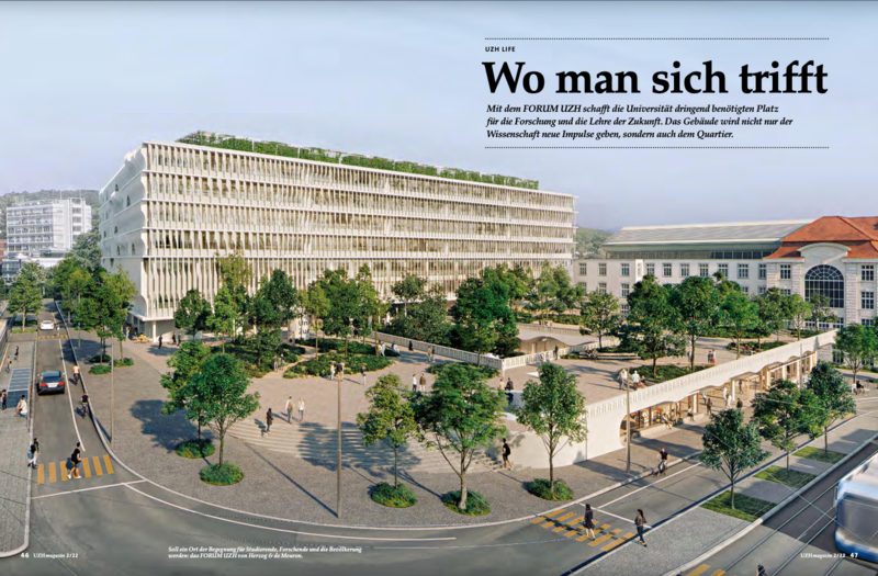 So präsentiert sich die Vision, die die Architekten Herzog & de Meuron mit ihrem Projekt für das neue Gebäude der Universität Zürich, das FORUM UZH, entworfen haben: «Das FORUM UZH ist ein Motor für das Entstehen von öffentlichem Leben in diesem universitären Quartier», sagt Architekt Jacques Herzog, «der Aussenraum ist ein öffentlicher, begrünter Platz und damit eine frei zugängliche Plattform für die Begegnung von Menschen. Das ist neu, das gibt es bisher nicht in diesem Zürcher Quartier.»