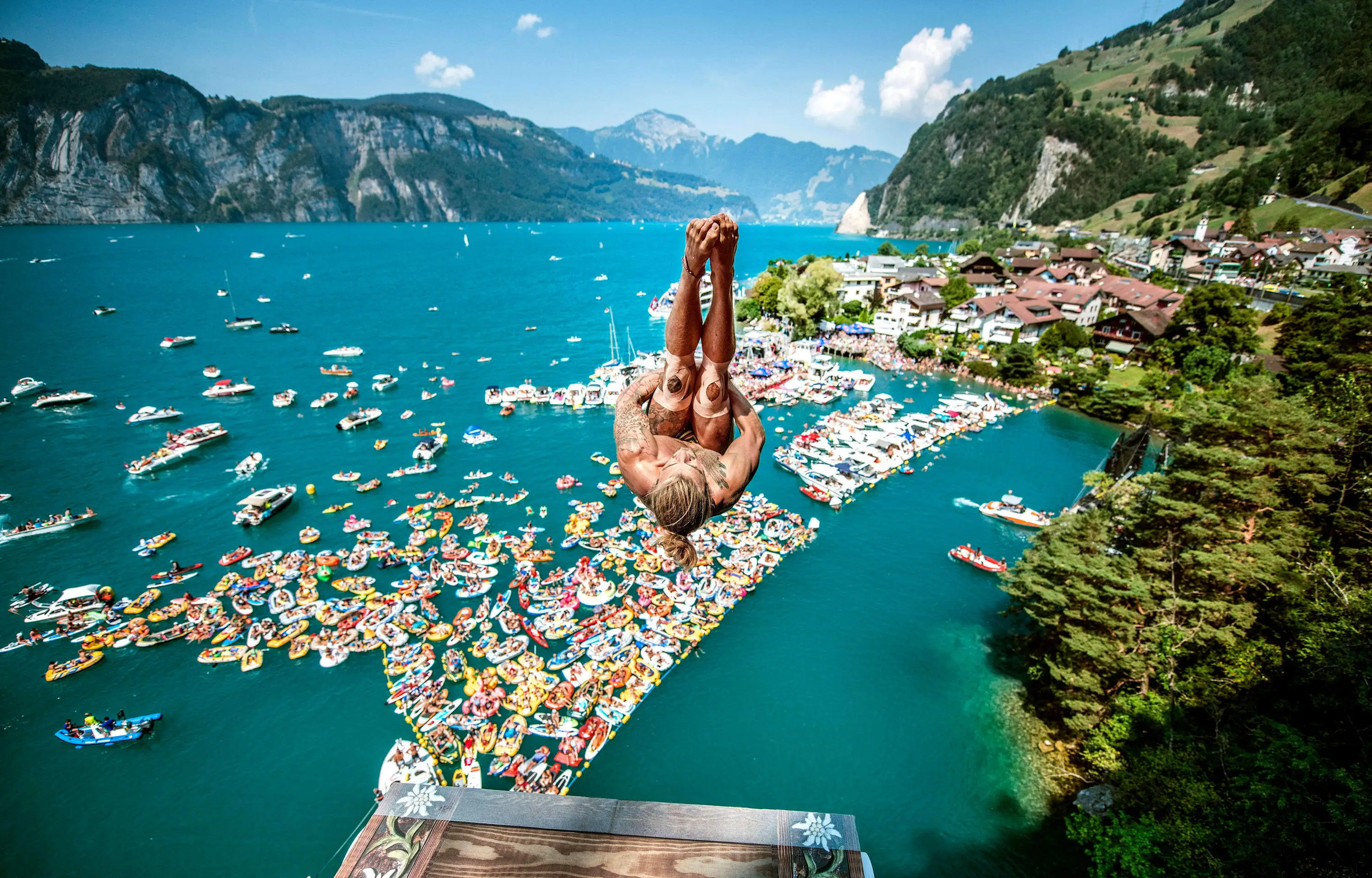 Er sieht so unglaublich locker aus, wie er da auf der Plattform tänzelt, 27 Meter über dem türkisgrünen Urnersee, und die Arme parallel in die Höhe reckt. Wie er die Zuschauer unten – es sind hunderte, die auf Schlauchbooten und Gummi-Flamingos im Wasser treiben – zu rhythmischem Klatschen animiert. Wie er sich dann ganz ruhig an die Absprungkante stellt, ein muskulöser, tätowierter, langhaariger Surfer-Typ. Und wie er dann abspringt – und in einer einzigen eleganten Bewegung drei Saltos und eineinhalb Schrauben in die zwei Sekunden packt, die ihm bleiben, bevor er mit 85 km/h die Wasseroberfläche durchschlägt. Als er wieder auftaucht, reisst er den Arm in die Höhe. Das Publikum beim «Red Bull Cliff Diving World Series»- Event 2018 in Sisikon jubelt. Matthias Appenzeller, Schweizer Lokalmatador und Debütant bei dem Wettbewerb, hat einen überzeugenden Auftritt hingelegt. Oder, besser gesagt, Absprung. Partystimmung bei den Zuschauern. Doch wohl nur die wenigsten von ihnen wissen: Die Vorbereitung für den Sprung, den sie eben sahen, die zwei Sekunden, die soeben vor ihren Augen verflogen, hat schon ein Jahr zuvor begonnen. Und der Sonnyboy, der ihn vollführte, hat auch noch eine ganz andere Seite.